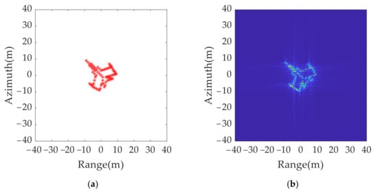 To further verify the effectiveness of the proposed algorithm, a simulated multiple points aircraft model and ISAR imaging without jamming are shown in Figure 14.