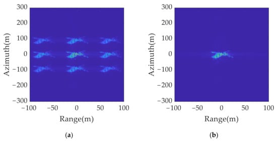 2D deception anti-jamming results: (a) anti-jamming results without eliminating sidelobe; (b) anti-jamming results after eliminating sidelobe and performing spatial position mapping.