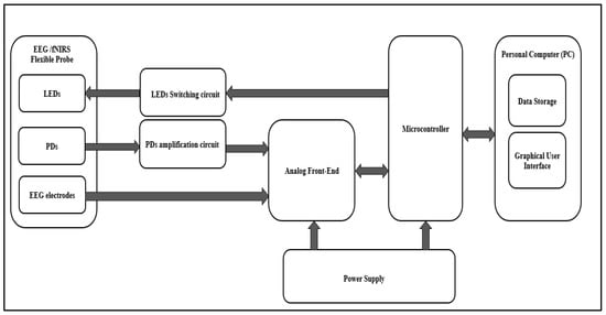 The proposed system consists of an EEG/fNIRS acquisition circuit, EEG/fNIRS power supply circuit, and a personal computer (PC). Figure 1 shows a general block diagram of the EEG/fNIRS system.