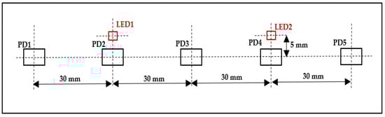 The light emitted from these LEDs passes through the skull in a banana-shape and is then sensed by five OE-PD0064-T PDs (Opto ENG Co., Ltd., Korea). These PDs are high-speed Si PIN PDs that respond to wavelengths ranging from 700 to 1100 nm and have a peak wavelength of about 970 nm and a size of about 4 mm × 5.4 mm. The distance between neighboring PDs, PD1 and LED1, PD3 and LED1, PD3 and LED2, and PD5 and LED2 is 30 mm, and the distance between PD2 and LED1 and PD4 and LED2 is 5 mm, as shown in Figure 2.