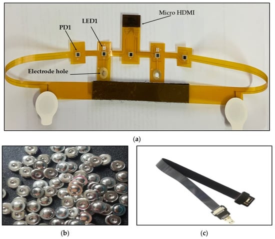(a) Flexible EEG/fNIRS probe, (b) 4 mm buckle, (c) micro HDMI FPC flat cable.
