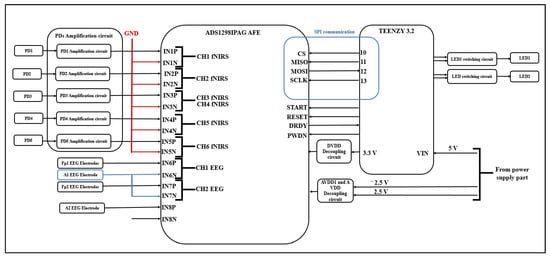 This circuit consists of an ADS1298IPAG AFE (Texas Instruments, Dallas, TX, USA) and a Teensy 3.2 Arduino (Adafruit, USA) board. The ADS1298IPAG AFE is responsible for acquiring EEG and fNIRS signals. The IN1P, IN2P, IN3P, IN4P, and IN5P differential analog-positive inputs are connected to the PD amplification circuit outputs, while the IN1N, IN2N, IN3N, IN4N, and IN5N differential analog negative inputs are connected to ground to form five inputs from five PDs, which results in six fNIRS channels.