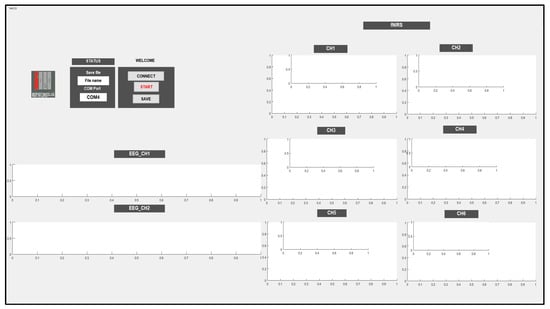 The GUI has the ability to choose a port that enables communication between the system and PC; also, it has the ability to save the data under a chosen name. In the beginning, the port should be chosen; then, it is necessary to press the CONNECT push button and then click the START push button to begin receiving data and display the data in the corresponding channels, as shown in Figure 7.