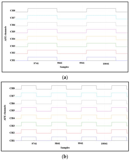 The proposed design is based on the ADS1298IPAG AFE IC for both EEG and fNIRS measurements. This IC is a low-power eight-channel AFE with eight high-resolution 24-bit delta-sigma (ΔΣ) Analog-to-Digital Converters (ADCs) and eight low-noise built-in Programmable Gain Amplifiers (PGAs). This AFE ensures a 0.75 mW power consumption at each channel with a data rate ranging from 250 SPS to 32 KSPS and a CMRR of about −115 dB []. ADS1298IPAG AFE is designed for use in ECG, EEG, and EMG measurements but can be still used for acquiring fNIRS signals [].