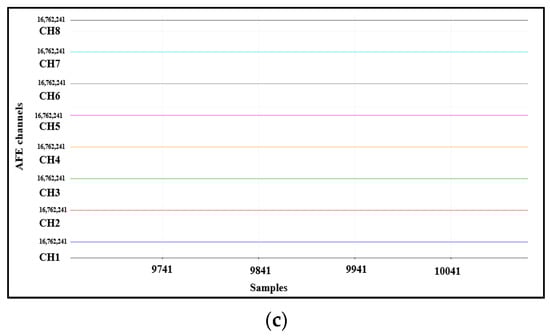 AFE internal test signals: (a) square wave with a frequency of 1 Hz, (b) square wave with a frequency of 2 Hz, and (c) DC mode output to give a constant voltage at each channel.