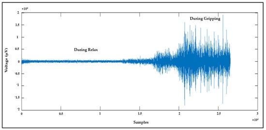 The fourth means to validate AFE is by collecting the EMG signal from channel 7 while using channel 8 as the ground. The EMG signal was recorded from a healthy subject while they relaxed their hand and then clenched it; the result is shown in Figure 11.