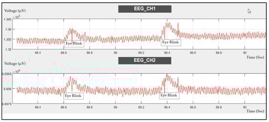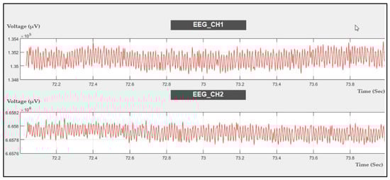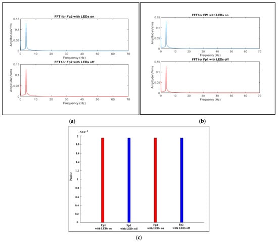 Comparing the results shown in Figure 19a with the findings in the study mentioned [], we can conclude that there is no crosstalk effect in the EEG when using our proposed system, as there are no significant peaks at the switching frequency of 16 Hz or its harmonics in the FFT spectra of the acquired signal. Additionally, the strength of the fNIRS switching noise introduced in the EEG is not high (0.002), the noise of around 16 Hz has the same value while the LEDs are on or off for both Fp1 and Fp2, and there is no deviation (almost zero).