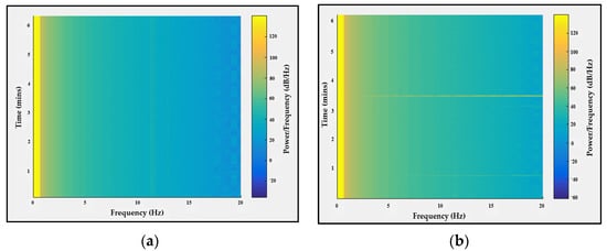 As the proposed system combines two electrically separate systems (EEG and fNIRS), electrical crosstalk between these systems may occur due to field coupling between the switching current in the fNIRS optode wires and the EEG electrodes [,,]. To assess the impact of the LED switching current in EEG, a resistive network phantom with electrodes positioned according to 10–20 system positions was used following the method of a study carried out in 2017 by von Lühmann, et al. [], which specified the phantom details and the experimental conditions that should be followed to assess the crosstalk in EEG in hybrid systems. In accordance with [], a phantom consisting of a 200 Ω resistor, to simulate the electrode skin impedance, and a 2.7 KΩ resistor, to simulate electrode skin conduction, was implemented. Then, at electrode position F8, a sine-wave test signal with an amplitude of 150 µV and different frequencies was supplied to the network. These two LEDs were placed between Fp1 and F3 and Fp2 and F4; then, the test signal was recorded for 70 s while the LEDs were on or off at positions Fp1 and Fp2. To evaluate the crosstalk using MATLAB 2021a, the FFT spectrum of the last 60 s of each measurement was calculated and the spectrum was converted to Vrms amplitudes, as shown in Figure 19a,b. For the two channels Fp1 and Fp2 using different test signal conditions while the LEDs were on or off, the signal intensities were extracted at a frequency of 16 Hz, which represents the switching frequency, and then summed to give the Pnoise value, which is used to calculate the strength of the fNIRS switching noise introduced in the EEG. Figure 19c shows the results.