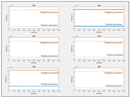 The probe shown in Figure 3a was placed on the surface of each phantom to record the value of the voltages (represents the light intensity value) versus the number of samples for 2 min. It was found that for all fNIRS channels, the brighter phantom gives higher voltage values compared to the darker phantom, which means that the reflected and scattered light intensity sensed by the PDS is high in the brighter phantom than in the darker phantom (darker phantom absorbs more light), as shown in Figure 17.