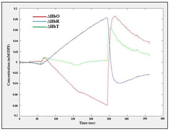 The ∆HbO, ∆HbR, and ∆HbT values recorded during the arterial occlusion experiment carried out in one channel are shown in Figure 18. This result reveals that the proposed system can efficiently analyze the change in hemodynamic concentration.