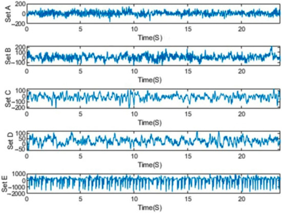 The Bonn dataset was recorded at the University of Bonn by a group of researchers, and it has been extensively used in the area of epileptic seizure analysis and detection [48]. The Bonn dataset is publicly available as 500-EEG single-channel data. It was sampled at 173.6 Hz with a 23.6 s duration. They consisted of five classes, viz., S, F, N, O, and Z, with 100 channel recordings in each class [79]. Five healthy controls in the relaxed and awake state with 10–20 standard electrode placement schemes contributed to the classes O and Z EEG surface data. Intracranial electrodes were used with five patients suffering from epilepsy to collect data of the S, F, and N classes. The hemisphere of the epileptogenic zone and the opposite hemisphere were used, respectively, for the recording of the F and S classes’ signals during the interictal (seizure-free) period. The ictal (seizure) period was taken into account in case of the recording of class S [79]. Samples of EEG signals of the dataset for each class are shown in Figure 2.