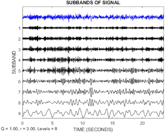 In this paper, the TQWT parameters for the two datasets are r = 3, Q = 1, and J = 8, respectively. Figure 3 and Figure 4 show the TQWT sub-bands for the Bonn and Freiburg datasets. In Figure 3 and Figure 4, EEG signals with different sub-band frequencies are shown. The selection of the EEG signal decomposition level was made similar Reference [81].
