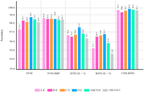 In the classification step, a variety of classification methods based on ML methods and DL are used. Classification techniques based on ML involve the support vector machine (SVM) [105] and k-nearest neighbors (KNN) [106] methods. The DL method is a CNN–RNN with the proposed number of layers and is another the novelty of the paper.