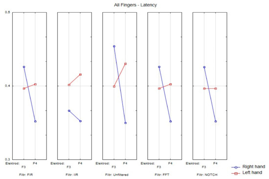 Presentation of the average latency values for the F3 and F4 electrodes for the right and left hands for selected filters.