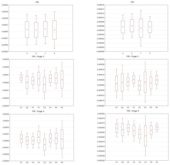 Figure 3, Figure 4, Figure 5, Figure 6 and Figure 7 exhibit comparisons of amplitude and latency values for each filter (divided into the left and right hand). Figure 4 and Figure 5 give a full picture of how latency and amplitude change. The presentation of the graphs includes data for both paradigms, i.e., for the right and left hand. Both Figure 4 and Figure 5 are box and whisker plots, showing the results for the applied FIR filter and its effect on the data averaged for all fingers, and for fingers 3 and 4, respectively. When analyzing the amplitude for the right hand movement (left panel), we can see the biggest scatter for electrode P4 and the smallest for O1. For the left hand, the largest scatter was obtained for electrode C4 and the smallest for electrodes F4 and P4. A graph was drawn for electrodes F3 and F4 showing the difference in the obtained latency values. The smallest differences were found for the right and left hands for the FFT, FIR and NOTCH filters (Figure 3).