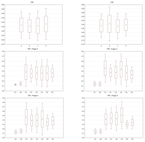 Wave amplitude values (V) FIR filter: Top drawing for all and individual fingers: a—all fingers, b—“2” fingers, c—“3” fingers, d—“4” fingers and electrodes P4. Middle drawing for finger 3 and all electrodes. Bottom drawing for finger 4 and all electrodes. Right hand (left in the photo) and left hand (right panel).
