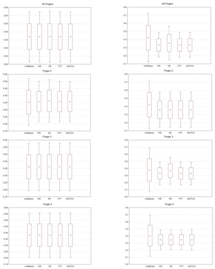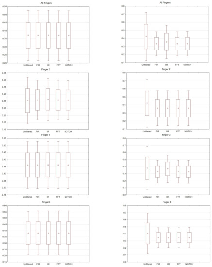 The differences between the right and left hand are noticeable; for example, the FIR filter, both for finger 3 and finger 4. For finger 3 in the left hand, the scatter is significantly larger compared to the right hand; the same goes for finger 4.