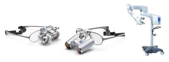 - Perrin, P.; Eichenberger, M.; Neuhaus, K.W.; Lussi, A. Visual acuity and magnification devices in dentistry. Swiss Dent. J. 2016, 126, 222–235. [Google Scholar] [PubMed]