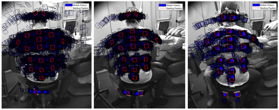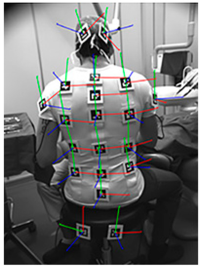 The accuracy in estimating localization and rotation of each ArUco marker depends on many factors; among them, the size in pixels, the viewing angle, and the region contrast play a major role. In our application, the distance of the markers varies in a short range and the whole environment is well illuminated; some difficulties in accurate detection can arise from oblique rotations, however, according to [21,22,23] the rotation estimation error, in a similar environment, is within ±1 deg. However, as detailed below, in our application we estimate the average rotation of trunk and head from the average of multiple markers, further reducing the estimation error.