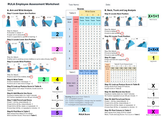In this section we focus on the RULA evaluation of WMSD risk detailing the content of three scoring tables (named Table A, B and C in Figure 5) to provide evaluation of exposure risk to WMSDs. The assessment is based on the analysis of the arm, wrist, neck, trunk, and leg position.