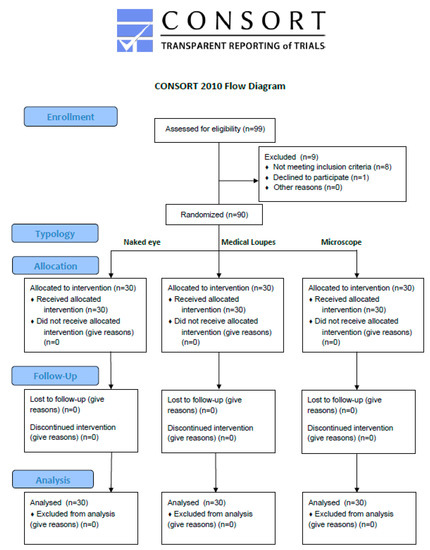 Once the patient had accepted to participate in the study, the appointment for the surgical procedure was planned and the patient was asked to consent for the acquisition of clinical pictures and videos too. The whole flow chart of the randomized trial is reported in Figure 10, according to the Consort 2010 Diagram.
