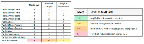 Considering the final RULA score, which provides the risk estimation for WMSD, we found that, for naked eye and medical loupes interventions there is a high risk, confirming the results in [5,6], while, for the surgical microscope, the total risk is classified just as ‘low’.