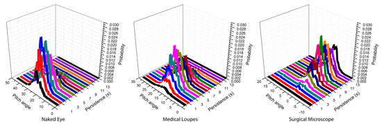 Analysis of static posture persistence of the neck pitch angle for naked eye, medical loupes and surgical microscope. The “persistence” represents the length of time the same pitch angle of the neck is kept during interventions. Each graph represents a normalized two-dimensional histogram of the occurrences; the vertical axis can then be assumed as the probability that a specific pitch angle is kept for a specific length of time.