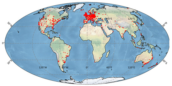Notwithstanding the large number of applications, like in nuclear and particle physics [26], astroparticle physics [27,28] or medical imaging [29], all semiconductor detectors are based on the same principle of collecting and analysing the charge liberated by incident radiation in the depletion region. Noteworthy, these same physical processes occur in CMOS sensors in domestic electronic devices like video recorders or the digital cameras used by mobile phones. Combined, smartphone ubiquity and their internet connectivity made them an ideal framework for creating a global network of radiation detectors coupled to central data storage. This idea underpinned several particle detection initiatives like CRAYFIS [7,30], DECO [8,13] and CREDO [9,10]. Our analysis is based on the CREDO detection data set, as currently, this is the largest publicly available data set of particle images obtained with mobile phones. The span of the CREDO device worldwide infrastructure is shown in Figure 1. It is worth noting that currently the total number of registering devices is over 10 thousand and is on the rise.