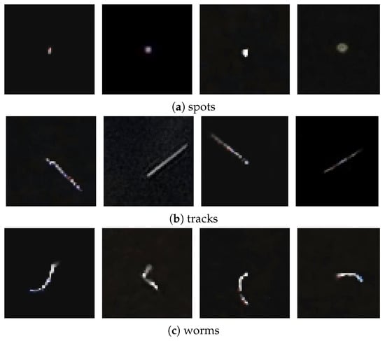 Compared to the basic classes of detection images (i.e., spots, tracks, and worms), the artefacts exhibit high brightness and large morphological diversity, making it difficult to classify them. Therefore this class of images was the most numerous in the data set.