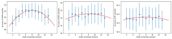 To verify this choice we examined the accuracy dependence on the maximum Zernike moment order. We performed this study for three classifiers, i.e., SVM, MLP and RF. The results of this comparison are shown in Figure 4 where we average classification accuracies and their standard deviations are shown. Additionally, we overlaid these results with lowest order polynomial (which turned out to be 2) able to fit them.