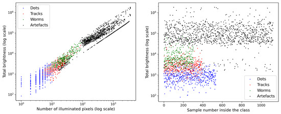 The comparison of the total brightness of the samples (Figure 2 and Figure 3), shows that this parameter obviously divides the samples into 3 classes: 1—spots, 2—tracks+worms, 3—artefacts, which is demonstrated in Figure 5. The luminosity based separation of artefacts vs. other classes was employed in the discussion of the CNN based trigger in [12].