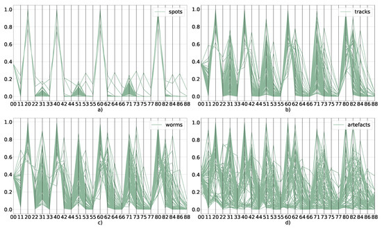 Parallel coordinate plots showing normalized values of Zernike moments for 95 examples of spots (a), tracks (b), worms (c) and artefacts (d). Numbers on the horizontal axes exhibit the n and m indices as per Equation (9).