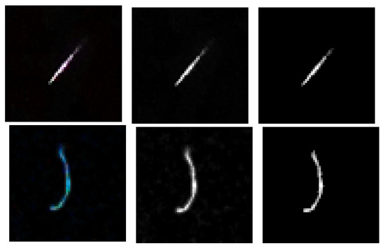The raw data of the single hit has been stored as a three-channel RGB images [37] and represented as 60 × 60 × 3 arrays with 8-bit precision per channel. The original images were then subject to the grayscale transformation realized by summing up the luminosities across the channels. Finally, the grayscaled images were denoised by applying the threshold calculated as a linear function of the mean and standard deviation of pixel values as defined in Equations (10) and (11).