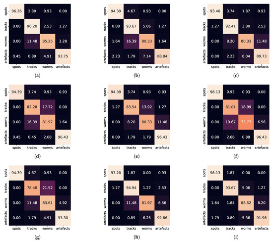 In Figure 11 we show the confusion matrices to illustrate the classification accuracy rate of best-performing classifiers. Not surprisingly all classifiers perform best on the spot class which is morphologically the simplest one. This class is most likely to be confused with the track class. Seemingly, the annotators were not consistent in annotating the slightly elongated spots and annotated them as lines occasionally. The artefact recognition rate was consistently higher than 90%. The worm class recognition rates were generally lower than 90%. This class was usually confused with tracks and to lesser extent with artefacts. The recognition rate of tracks was strongly conditioned by the classifier’s capability to distinguish tracks and worms. Those classifiers which were able to achieve this (such as MLP, SV, SVC, OVO/SVC and OVR/MLP) performed with an accuracy exceeding 90%.