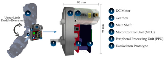 The servo-driven joint is composed of a high-speed DC motor coupled to a mechanical transmission that provides an optimal ratio of high torque and moderate speed for the intended application. As seen in Figure 1, the motor frame and gearbox are coupled to a rotational hinge that binds two segments of the prototype upper limb exoskeleton together, providing actuation at the elbow joint level for 1-DoF extension and flexion motion. On the other hand, the specifications of the DC motor and the gearbox used are presented in Table 1 and Table 2, respectively.