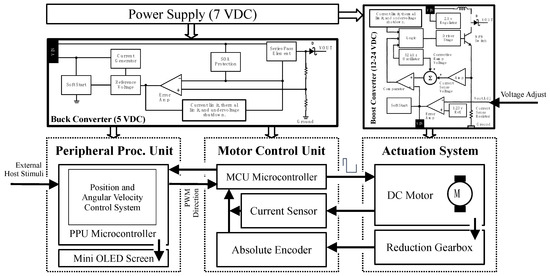 In addition, the circuit board comprising the MCU also contains sensors that continuously monitor the behavior of the actuation system. (1) A current sensor is included, allowing a further algorithmic torque calculation. (2) An embedded high-precision absolute encoder determines the position of the main shaft at the gearbox output and before coupling to the exoskeleton, eliminating possible structure oscillations. This encoder type is less susceptible to magnetic disturbances, thus increasing its reliability. Figure 2 below shows the functional block diagram of the proposed system.
