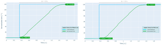 Characteristic response curves over a 0° to 120° movement using a 24 VDC nominal voltage at the input of the actuation system. The figure shows the test without and with load, respectively.