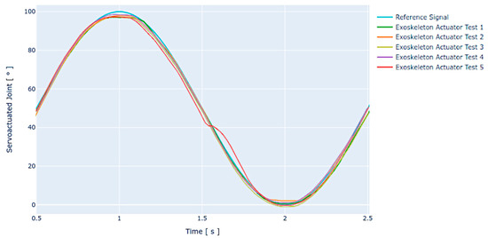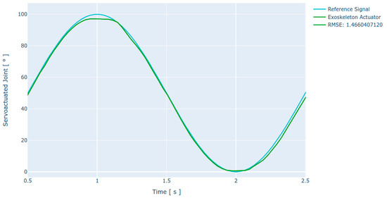 The absolute error for the servo-driven joint motion was 1.06° (without load) and 1.17° (with load). This error is low and is intended to be compensated by the control system. However, it is necessary to calculate the RMSE over the joint motion over a pattern, giving a more realistic insight into the system’s behavior when used in real-life applications. Tracking of a sinusoidal reference pattern is satisfactory, resulting in an RMSE of 1.46°. It is observed that the motion is accurate at a high angular velocity, reaching 96 °/s, which coincides with the results obtained with the step stimulus. The response curve obtained is presented in Figure 7.
