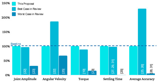 As for the absolute accuracy of actuator movements, controllers using sliding modes and other techniques evidenced in the review allow a significant error reduction. This proposal yields an absolute error of 1.17°, which is a larger error value when it is compared to the results shown in [25] (0.4° absolute error), and compared with the results shown in [26] (0.2° average error). However, this proposal is better compared to [28,31], since the latter has a higher RMSE error (in some cases exceeding 20°). Despite this, this proposal can be improved in terms of the absolute accuracy of the servo-driven joints and achieve better reference values, as shown in [30].