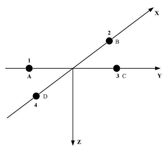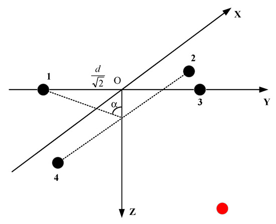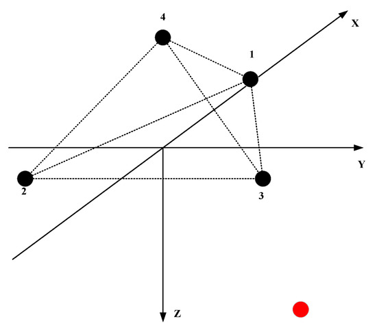 Similarly, the source coordinates can be calculated according to formulas (8)–(10). The general regular triangular pyramid array is shown in the Figure 4: