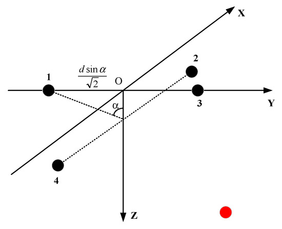 The distance between array elements 1,3 and 2,4 is , and the included angle between plane BAD and plane BCD is . The coordinates of the four elements are (0, , 0), (, 0, ), (0, , 0), (, 0, ). The vectors composed of array elements , , . Here, the red dot indicates the location of the source. Similarly, the relationship between the incident azimuth and pitch angle of the signal and the reception delay can be obtained by vector projection. The details are as follows: