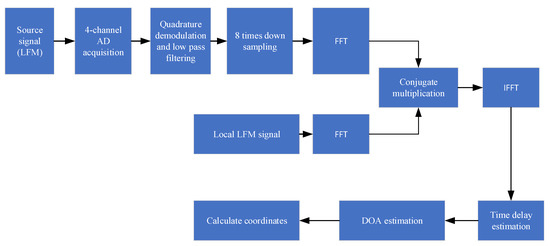 Because the localization performance of two stereo arrays will be different under different included angles , it is necessary to simulate and analyze the specific localization effect of the stereo array under different included angles. During the simulation, the array element spacing was 0.32 m and the source was the LFM signal with a center frequency of 10 kHz and bandwidth of 5 kHz. The sampling rate of the received signal was 80 kHz. The specific processing flow of the algorithm is shown in the Figure 6: