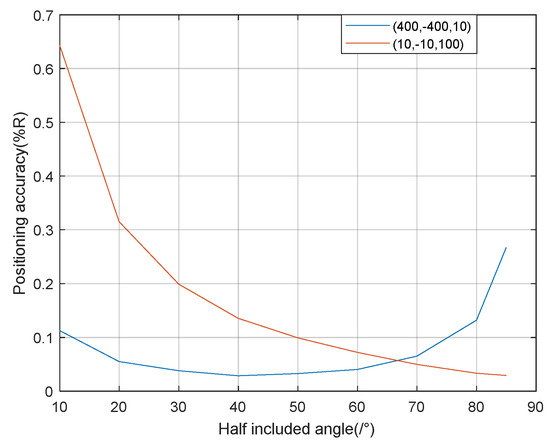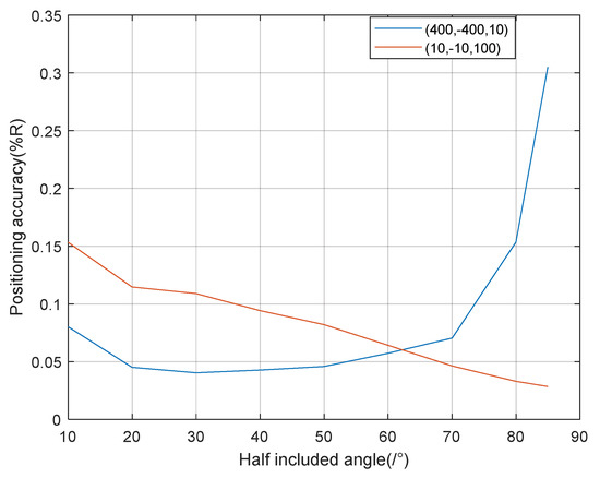 Positioning accuracy of stereo array 2 at different half-included angle.