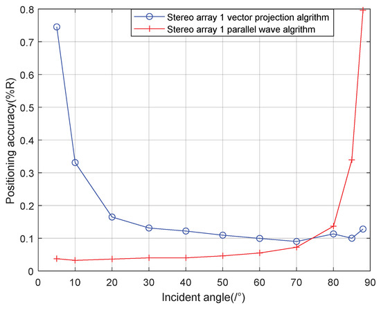 It can be seen from Figure 13 that when the incident angle is 0–80°, the positioning accuracy of the cross array parallel wave method is better; At 80–90°, the positioning accuracy of the stereo array 1 vector projection method is better.