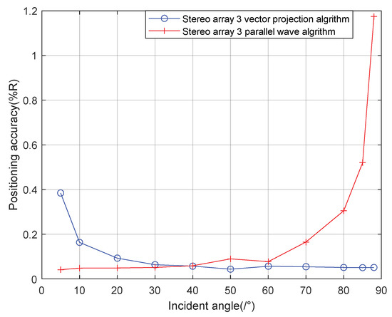 It can be seen from the Figure 14 that when the incident angle is 0–40°, the positioning accuracy of the cross array parallel wave method is better; the positioning accuracy of stereo array 3 vector projection method is better at 40–90°. Generally speaking, the performance of the vector projection method is better than that of the cross array at a high incident angle, and that of the cross array method is better than that of the vector projection method at a low incident angle. In practice, the combination of stereo array vector projection method and cross-array algorithm can be considered.