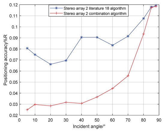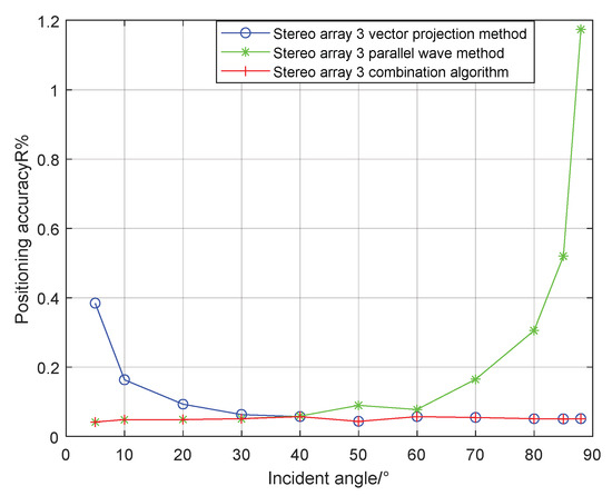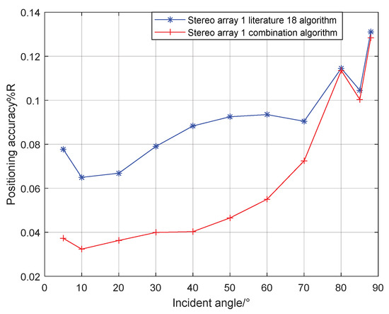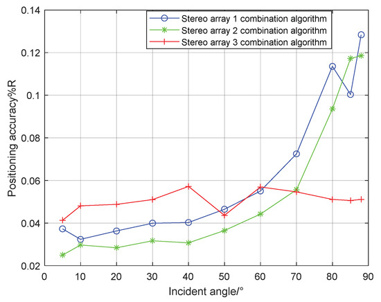 As can be seen from Figure 19 and Figure 20, the combined algorithm of stereo arrays 1 and 2 has better localization performance than the algorithm in literature 18. When the incident angle is less than 70°, the positioning accuracy of the combined algorithm of stereo array 1 is 0.02–0.04% higher than that of literature 18. When the incident angle is greater than 80°, the positioning accuracy of the two is close. When the incident angle is less than 85°, the positioning accuracy of the combined algorithm of stereo array 2 is 0.03–0.2% higher than that of literature 18. When the signal incidence angle is greater than 85°, the positioning accuracy of the two is close. Figure 21 shows that compared with the precombination algorithm, the positioning accuracy of the stereo array 3 combination algorithm is improved by 0.35% at a small incidence angle and 1.12% at a large incidence angle. Figure 22 compares the positioning accuracy of the combination algorithm of three stereo arrays. The positioning accuracy of stereo array 2 is highest at a low incident angle and that of stereo array 3 is highest at a high incidence angle. Overall, the positioning accuracy of stereo array 3 is uniform, all below 0.06%.