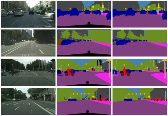 Qualitative results on Cityscapes. First column: Original input images; second column: Labels of ground truth; and Third column: Our segmentation results.