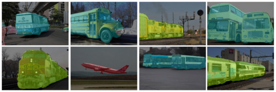 Apart from Cityscape and Camvid, we display our segmentation results on KITTI [43] and PASCAL VOC 2012 [44] (as shown in Figure 9 and Figure 10 below). KITTI (Karlsruhe Institute of Technology and Toyota Technological Institute) are popular datasets for mobile robotics and autonomous driving. It consists of 200 semantically annotated training samples as well as 200 testing samples. The data format and metrics comply with Cityscapes Dataset. The PASCAL Visual Object Classes (PASCAL VOC) 2012 dataset contains 20 categories including persons, vehicles, planes, boats, buses, cars, trains, etc. Each of them has pixel-level segmentation annotations, which has been widely used as a benchmark for semantic segmentation tasks.