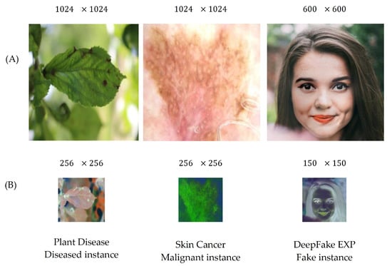 These three application domains have attained very high interest in the last years [,,,,,,,] for many different reasons. More specifically, regarding the plant disease problem, due to the massive agriculture improvement, it is necessary to automate plant disease detection by using technologies such as air drones and cure ill plants fast and accurately []. Regarding skin cancer detection, the fast recognition and treatment in its earliest stages is crucial for its treatment and curing process. The DeepFake faces image detection problem recently has attained very high interest [,,,,,,]. The recent invention and the continuous development of the Generative Adversarial Networks (GANs) [] technology has made possible the generation and the creation of high quality and extremely realistic fake images and videos being very hard even for experts to recognize them. These fake images/videos can be extremely harmful for human rights, especially when the deepfakes are used maliciously as a source of misinformation, manipulation, and harassment.