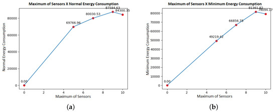 Maximum of sensors versus energy consumption. (a) Normal energy consumption. (b) Minimum energy consumption.